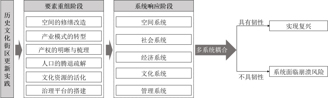 历史文化街区的更新需要兼顾空间功能和社会组织体系,将对空间的保护与对社会的认识相结合,具有社会-空间双重概念(边兰春,石炀,2017)。所以历史文化街区是一个集合“空间-社会-经济-环境”的完整的系统单元,针对其的更新工作是一项综合性、全局性、政策性和战略性很强的社会系统工程(阳建强,2018)。更新实践的实质即是通过对历史文化街区内部各种要素的重组和整合,重新寻找各系统之间的耦合关系,打破原有部分已经僵化的固有结构以促进形成新的稳态,从而支持历史文化街区进一步的复兴和发展。若在处理新的要素整合过程中无法构建具有韧性的各系统的耦合关系,不当处理其中出现的矛盾,则整个历史文化街区的复杂系统仍将会面临崩溃的风险(图2)。
