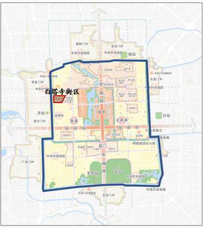 白塔寺历史文化街区位于北京市西城区,在北京中轴线西侧,西至阜成门北大街、南至阜成门内大街、东至赵登禹路、北至西工弓匠胡同、大茶叶胡同,总占地面积约为37公顷,包括安平巷、宫门口、富国里、北顺四个社区,具有丰富的历史和文化资源(图3)。