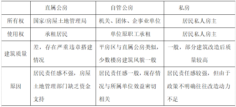 任何产权都具有多重属性称为“产权束”,其中各项权利可以为一个主体也可为多个主体(冯立, 唐子来, 2013)。在市场经济环境的影响下,房屋的现状保护情况与房屋的产权情况有着密切的联系(表1)。居民私有产权房屋由于产权明确且维护动力较高往往保存情况良好。而针对老旧社区大量的公产建筑,其占有权、使用权、经营权和收益权实际上已经分离。公房居民由于只享有使用权,缺乏对房屋维护的积极性,并不断侵占公共空间以扩大自身利益,造成了大量老旧社区破败的物质空间环境。
