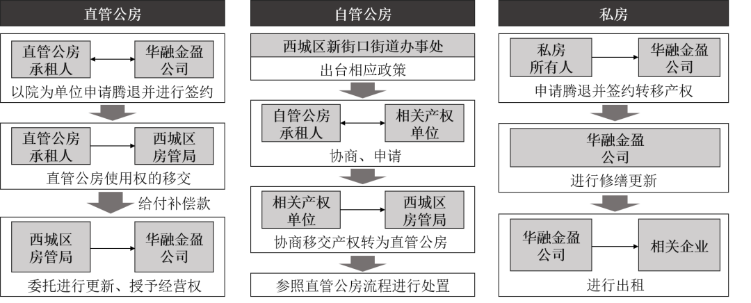 在更新实践过程中,依据直管公房、自管公房、私房三种不同的产权现状提出了具有针对性的产权处置方式(图8)。以“整院腾退”为主要人口疏解模式,通过华融金盈公司的介入对现有的权利进行主体和权属的明晰、界定,并通过更新过程中的空间重组、人群调整等方式,对产权进行重新配置,从而界定在保护和更新过程中后续产生的新生权利、受益与责任。探索不同类型的产权模式下的市场化运作机制,在规划指引下允许对已腾退的公房开展合理的利用和经营,将外部性效益内部化(黄瑛,2012),并通过使用权、经营权和收益权的分离,充分调动各主体的积极性,在白塔寺逐步建立起以实施主体为主导,多元主体共享的产权结构体系。