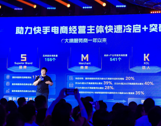 过去一年,快手电商服务商所服务的月GMV首次破50万商家,冷启时间平均缩短20%。他们服务的品牌自播GMV增长30倍,被服务的冷启中小商家较未被服务的GMV增速高出 35%。