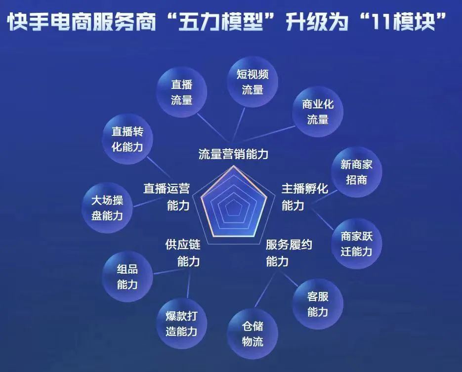 这些高速增长的数据背后是快手电商服务商服务能力的全面升级,不仅从去年的“五力模型”升级到“11模块”,在组织能力和服务的标准化方面,快手电商均对服务商提出了新的要求。