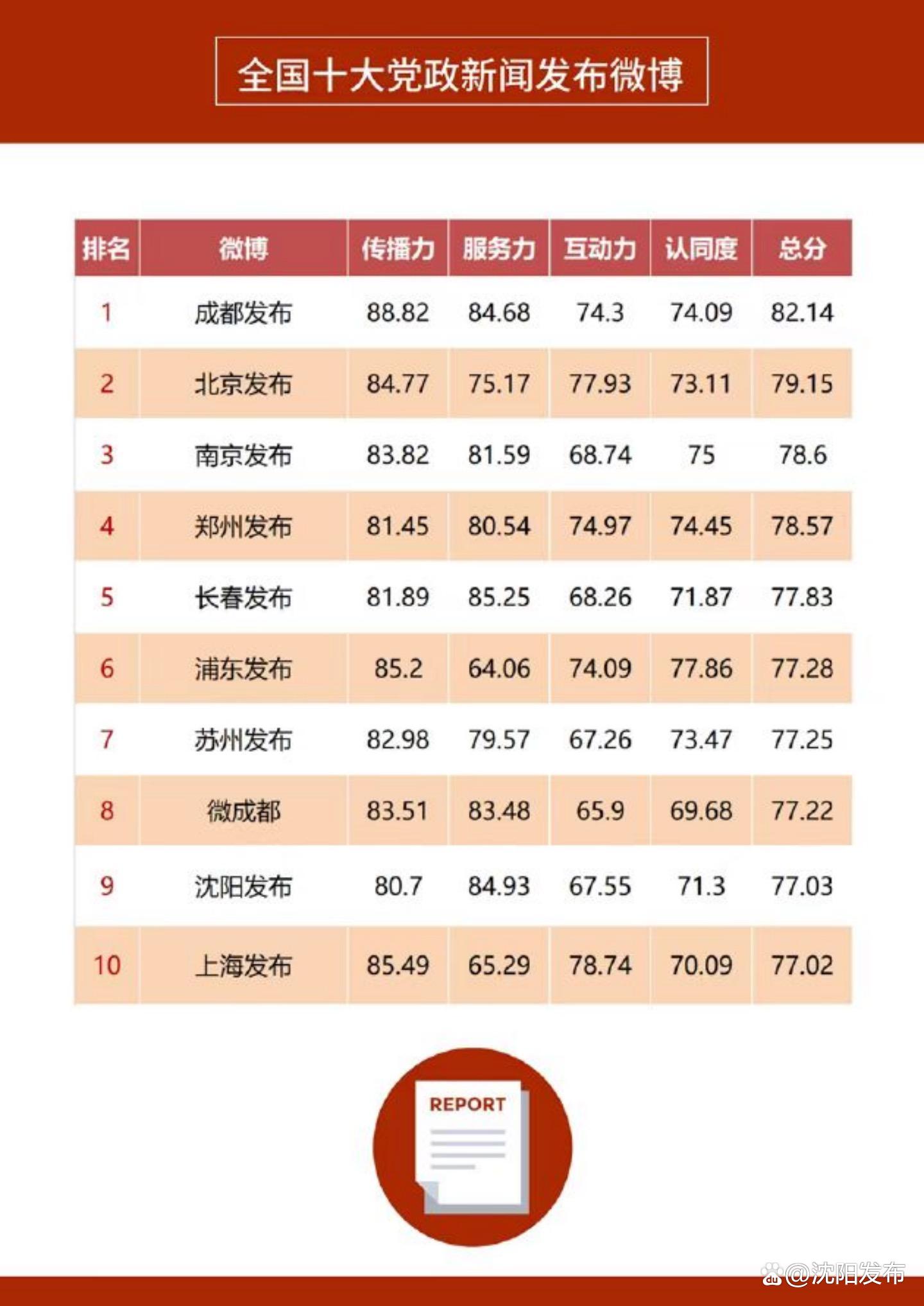 8月10日,人民网舆情数据中心联合新浪微博发布“2022年上半年度政务微博影响力报告”,沈阳发布微博以总分77.03位居“全国十大党政新闻发布微博”第九位。