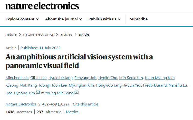 这一研究被发表于Nature Electronics,论文题目就叫《具有全景视野的两栖人工视觉系统》(An amphibious artificial vision system with a panoramic visual field)。