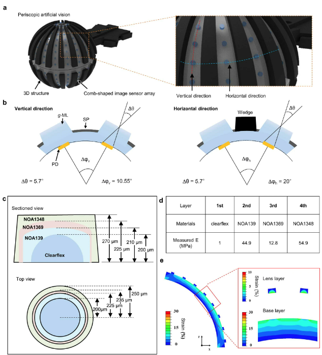微透镜表面平坦,无论空气和水之间的外部折射率如何变化,都能保持焦距,球形基板上的梳状图像传感器阵列显示出极其广阔的视野,几乎覆盖了整个360方向。