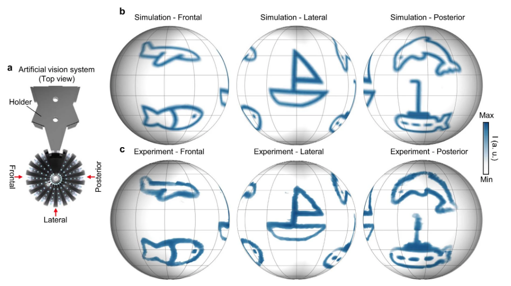 通过对5个不同距离和方向的物体进行成像,在空中和水中实验中测试了两栖和全景成像能力,研究人员发现该人工视觉系统在陆地和水生环境中提供了一致的图像质量和近360度视场,这意味着该系统可以同时看到水下和陆地的世界!