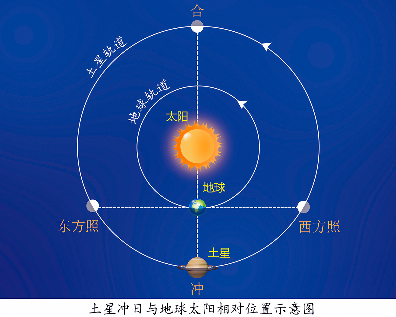 何谓“土星冲日”?当土星运行至与太阳黄经相差180°时(见土星冲日与地球太阳相对位置示意图),就是土星冲日。土星冲日时,土星距离地球最近,土星最明亮,并且整夜可见。今年2月5日,土星、太阳和地球依次运行至近似一条直线,这叫“土星合日”,土星不可见。5月26日,土星“东方照”,即土星、地球和太阳排成直角三角形,直角在地球处,土星凌晨可见。8月15日,土星、地球和太阳三者依次运行至近似一条直线,这叫“土星冲日”,土星整夜可见。11月11日,土星“西方照”。即土星、地球和太阳围成直角三角形,直角在地球处,土星晚上可见。