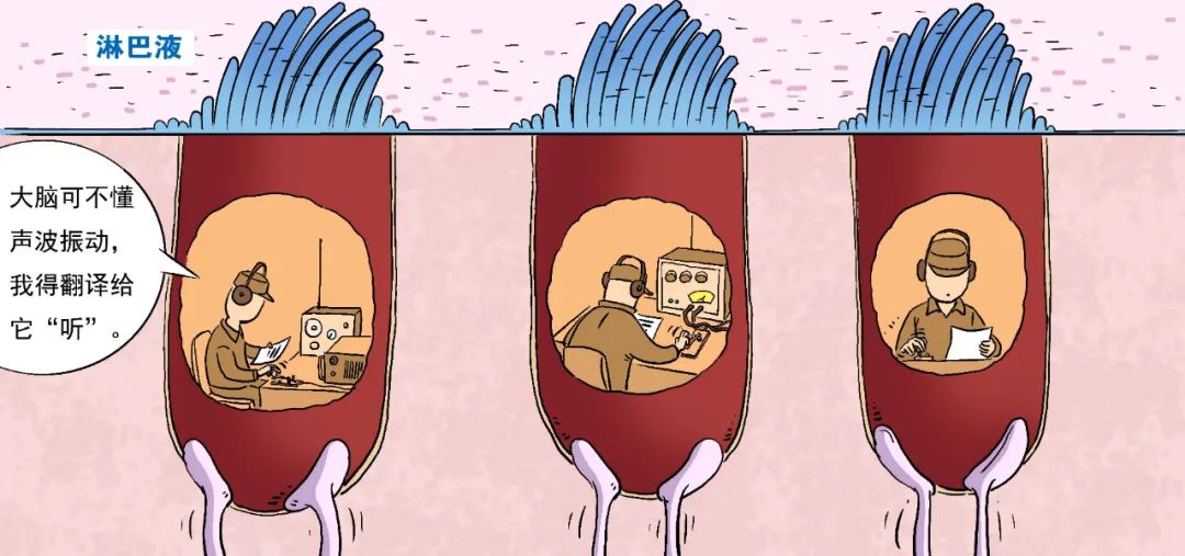“翻译员”——毛细胞在淋巴液的推动下摆动,将振动“翻译”成神经电信号,以便大脑能够理解。
