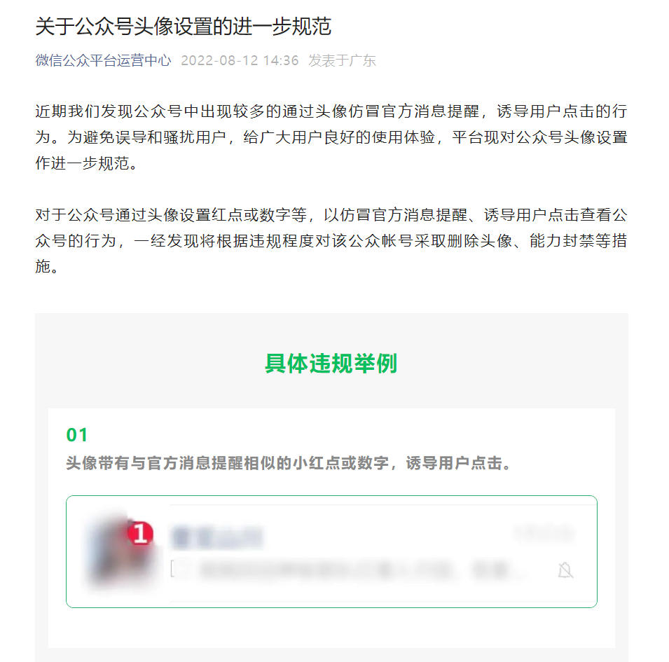 对于公众号通过头像设置红点或数字等,以仿冒官方消息提醒、诱导用户点击查看公众号的行为,一经发现将根据违规程度对该公众帐号采取删除头像、能力封禁等措施。