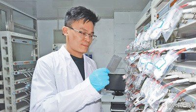 电池实验室里,王家钧正在进行电池测试研究。本报记者 张艺开摄