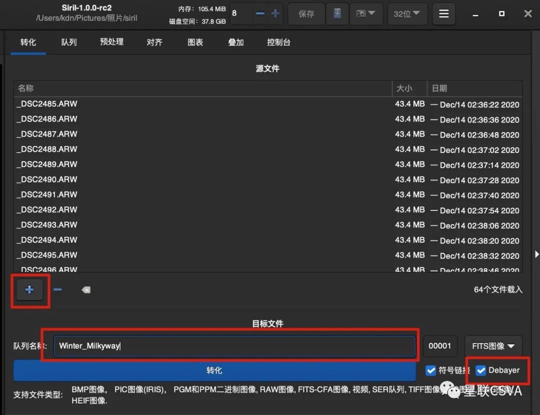 2.将raw文件导入,起个名字,勾选Debayer(否则会作为黑白照片处理),然后点击转换按钮,也可以把Lightroom矫正完成导出的TIFF文件加载进来。当然了,严格来说,加载镜头配置文件是一个非线性过程,不应该在堆栈这些预处理步骤之前进行,这个就不在这里讨论了。