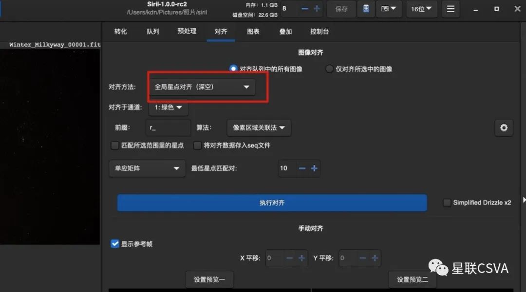 5.选择全局星点对齐,其它的选项不需要修改。从对齐方式中可以看出来,SiriL实际上支持对各种类型的天体进行叠加。点击执行对齐,然后SiriL会对每张照片进行星点侦测,然后开始对齐,这可能是一个漫长的过程,具体要看电脑配置。