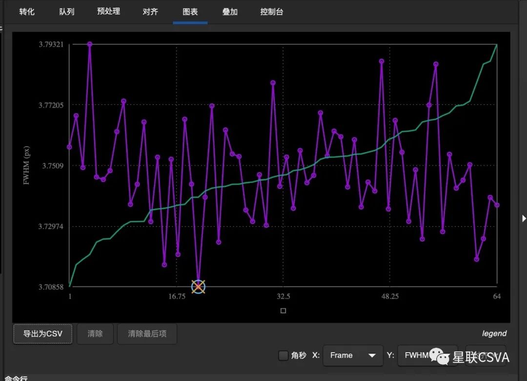 6.对齐完成后,软件会呈现出一个折线图。这是一个参考,FWHM(px)指的是星点的半宽全高。可以简单理解为这个值越低星点越小,越细腻、没有出现抖动。这是一个参考,在叠加时会用到。