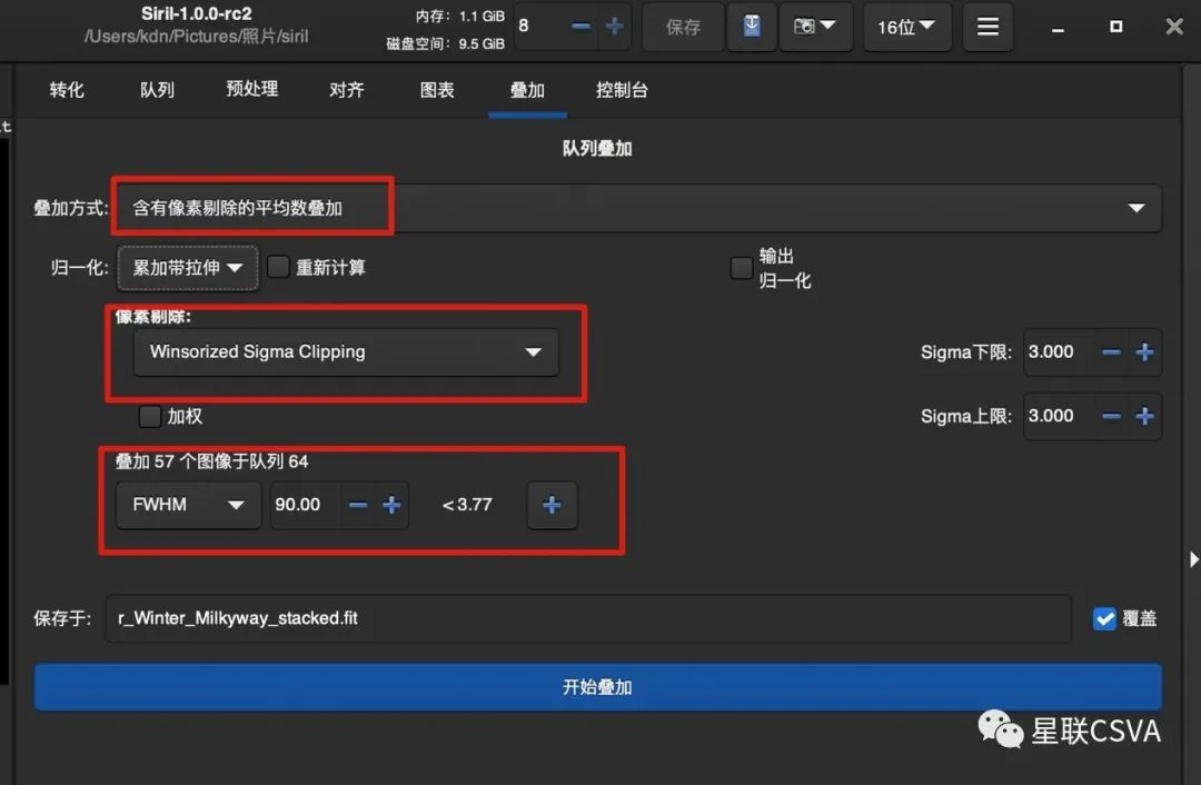 7.最后一步,开始叠加。叠加方式可以选带有像素剔除的平均数叠加。像素剔除就是会对照片中的杂物进行排异,比如飞机。最后可以根据上一步中的FWHM,将比较差的照片排除。比如选择90%,那10%星点最为肥大的照片就会被排除掉,不参与本次叠加。