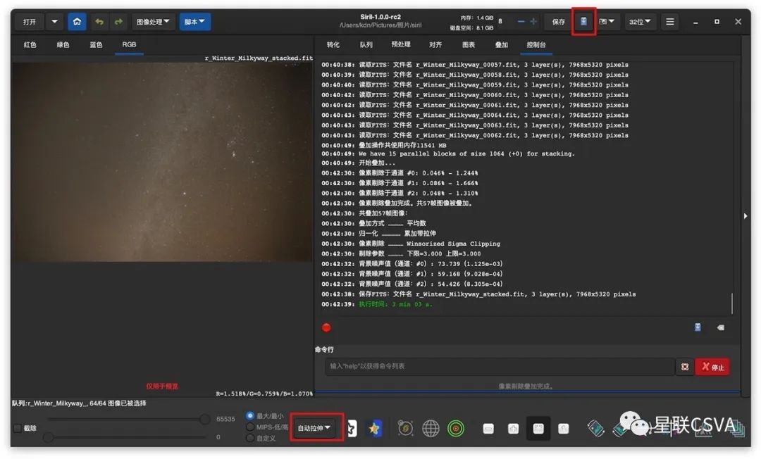 作为一款专业的天文图像处理的软件,SiriL的操作显然比Sequator要麻烦一些,而且不像后者那样可以冻结地景,一次出图。但从菜单中就可以看出,堆栈只是这款软件的功能之一,它可以完成整个深空照片的处理流程,从前期的预处理、叠加到后期的色彩校正、降噪,比如菜单中的背景提取功能,时常被用于压低光污染。
