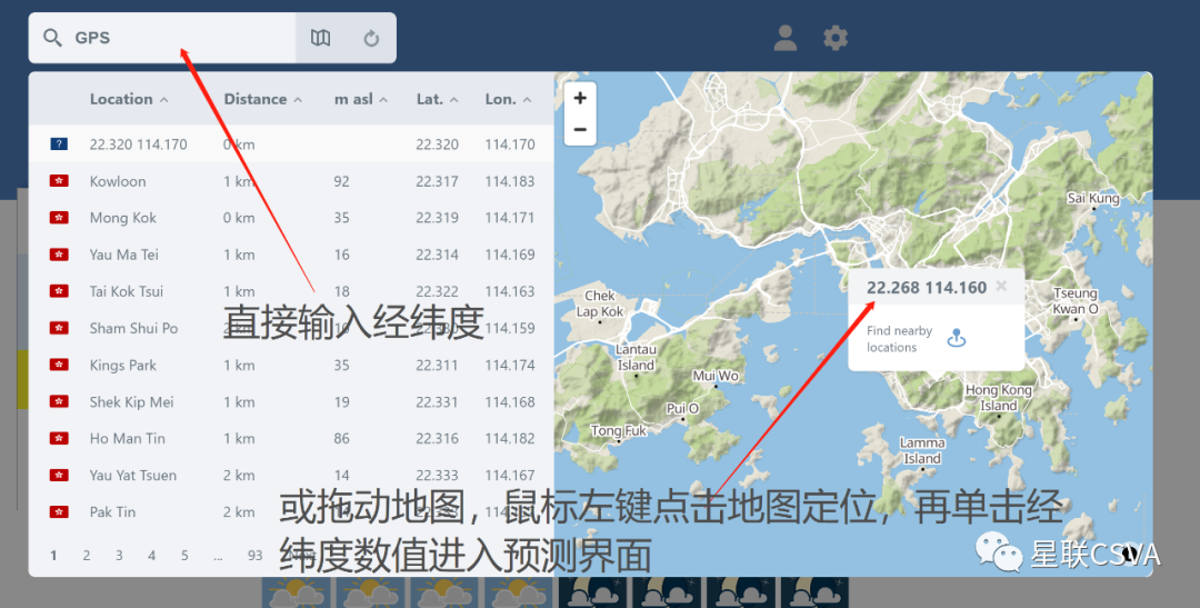 3. 鼠标左键点击地图定位点,然后单击经纬度数值进入预测界面。如果事先用巧摄等软件规划过拍摄地,也可以直接输入经纬度信息。