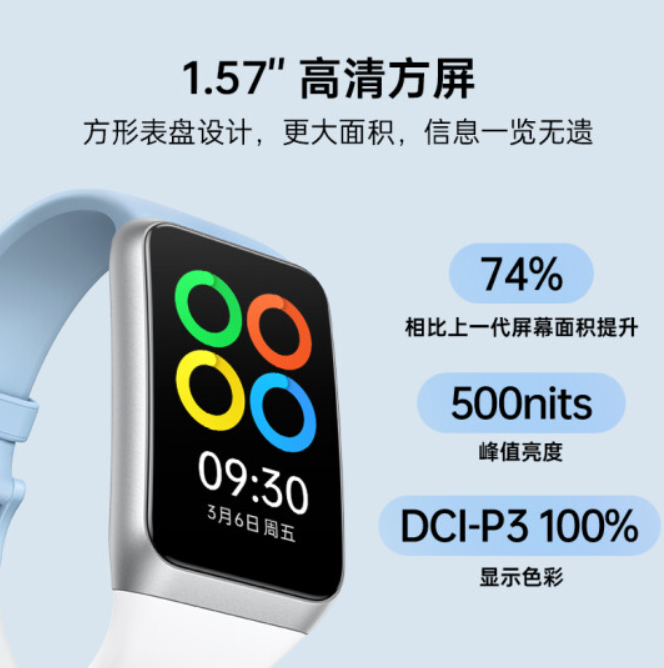 作为一款手环产品,OPPO 手环 2 却拥有媲美手表的大屏幕,1.57 英寸超清全面大屏,拥有 302 PPI,屏占比相对上一代提升了 47.5%,屏幕面积更是提升了 74.6%。不仅如此,OPPO 手环 2 的屏幕还具备 500 尼特的峰值亮度,即使在户外强光之下,也能清晰显示内容。
