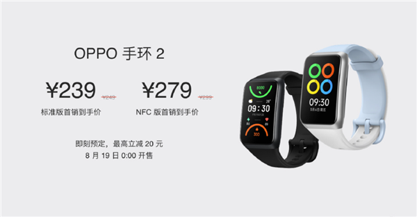 目前,OPPO 手环 2 系列已经开启预售,预定至高立减 20 元,标准版首销到手价 239 元,NFC 版 279 元!将于 8 月 19 号零点正式开售。