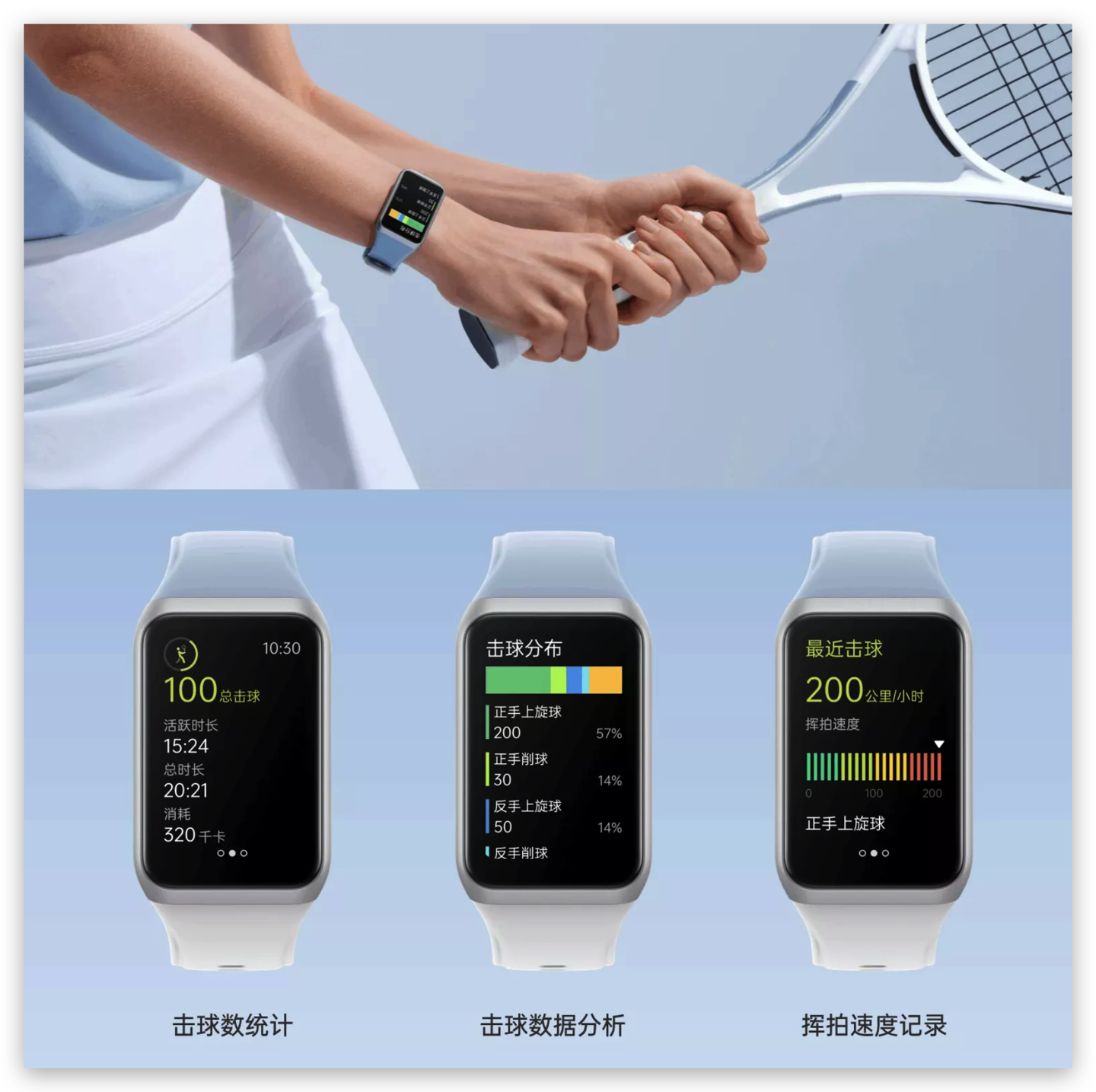 在运动监测方面,OPPO 手环 2 支持跑步、骑行、游泳等 100 种运动主动监测,以及健走、跑步、椭圆机、划船机 4 种常见运动自动识别。同时新增了专业网球运动模式,可以识别多种类型网球动作,记录击球次数、挥拍次数、活跃时长、心率及消耗等数据,让用户更为详细地掌握自己的运动水平。