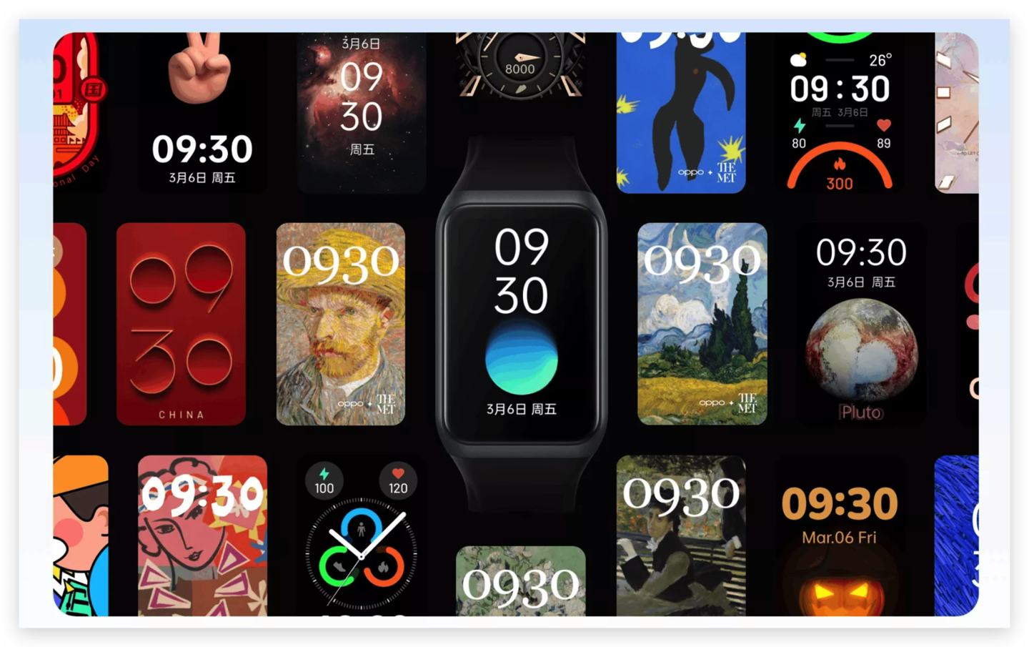 在表盘设计上,OPPO 手环 2 提供了大都会系列表盘,包括梵高、莫奈、马蒂斯等一系列艺术表盘等,带你畅游艺术大师画作,手腕上的艺术馆。