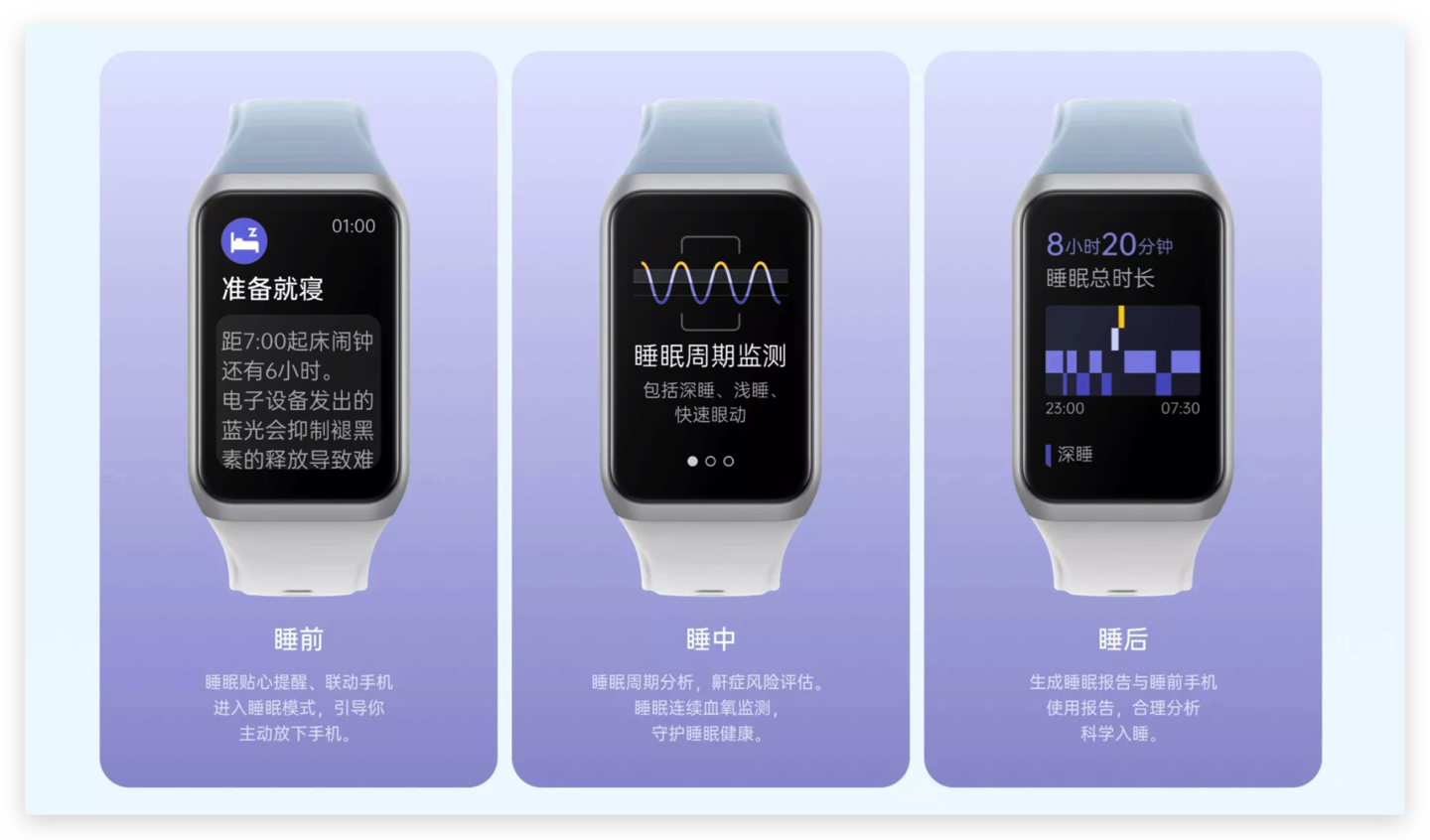 睡眠监测是手环产品的核心使用场景,OPPO 手环 2 针对睡眠监测功能进行升级。全新的 Osleep 全场景睡眠监测可以在入睡前设定睡眠目标,并且实现手环联动手机进入睡眠模式、入睡后自动暂停音乐等;睡眠中可监测出入睡、睡眠时长、睡眠分期(深浅睡结构)、快速眼动 REM、睡眠血氧,及时发现问题,并提出改善建议;支持睡眠连续血氧监测,以及支持鼾症风险评估,手环联动手机记录睡眠鼾声,辅助辨别呼吸困难等问题。