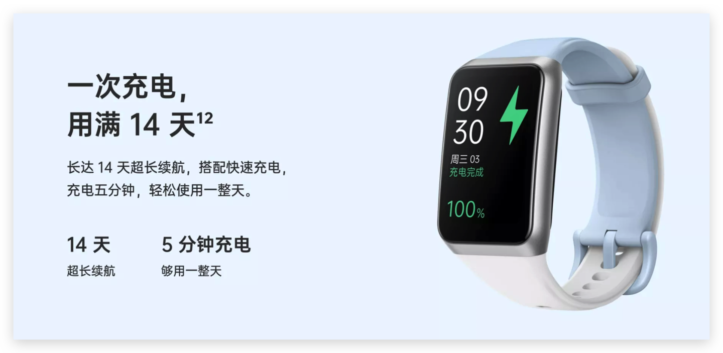 续航方面,OPPO 手环 2 内置了 200mAh 电池,提供轻度场景 14 天 + 、中度场景 10 天 +、重度场景 5 天 + 续航能力,以及 60 分钟充满的快充,充电 5 分钟即可使用一整天。