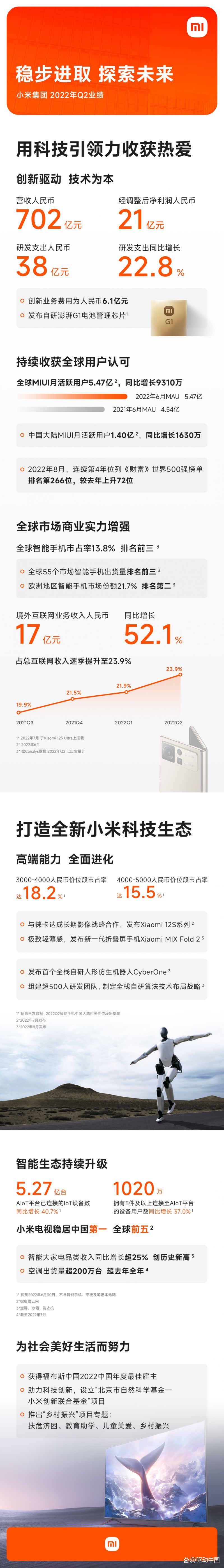 2022年Q2,面对特殊时期带来的经济波动和需求放缓考验,小米长期积累的能力建设支撑其发展韧性,为市场注入信心,同时强大的内生动力将带领小米穿越短期波动,重塑长期发展格局。