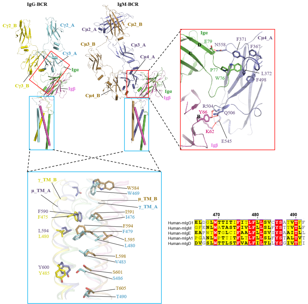 人类B细胞受体有5种亚型,在该研究中,课题组解析了人体IgG和IgM两种亚型的BCR复合物结构,BCR复合物结构包含了一个膜结合形式的免疫球蛋白(mIg)同源二聚体,用于识别抗原,以及一个膜结合形式的Igα/β(CD79α/CD79β)异二聚体,用于信号传递(化学计量比为1:1)。其中,mIg二聚体包含了Fab和Fc结构域、连接肽(CPs)和跨膜(TM)螺旋,Igα/β结构由两个胞外Ig样结构域、CPs和TM螺旋组成。IgG和IgM-BCR复合物的组装分别由胞外的IgG-Cγ3和IgM-Cμ4与Igα/β的Ig样结构域,以及连接肽、跨膜螺旋承担。