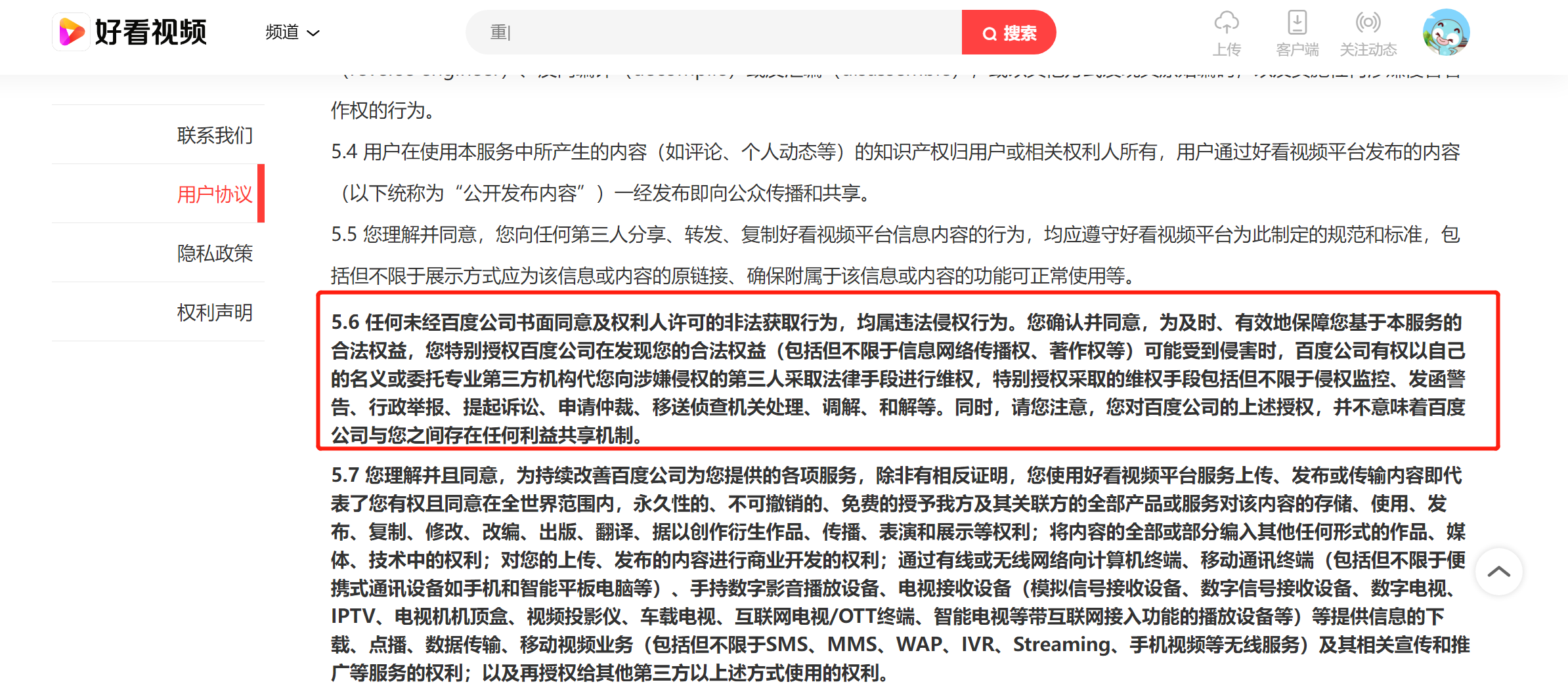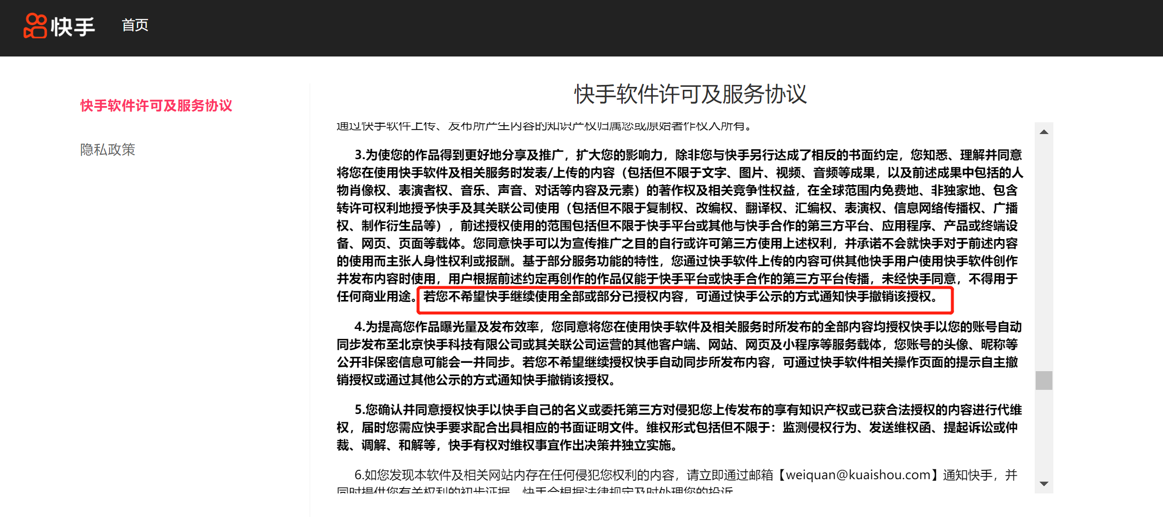 我提醒他,仔细看没看平台服务协议,也许作品内容从同意合同约定开始,版权就被无偿授权给了平台,版权交易和维权收入或许就与你无关,(详见下图示例)你知不知道?网红瞪大眼睛看着我,就像我在说他的孩子不是自己的一样,惊恐得说不可能,为了让他冷静下来,我只好拿平台服务协议条款给他看,还是一脸不相信,我说“信不信由你”。