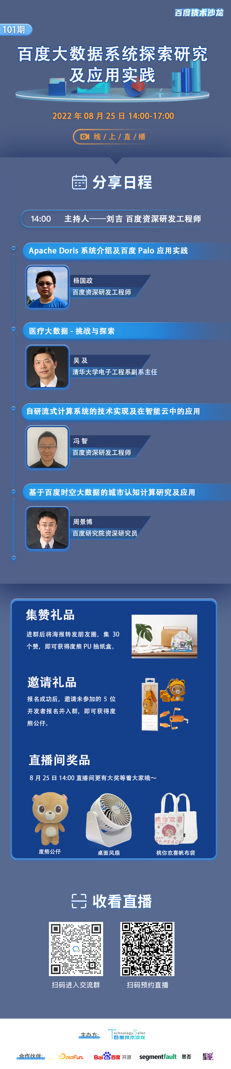 百度多年来积累了非常丰富的大数据系统研究开发、应用实践的经验:为Apache 基金会贡献的Doris数据库项目,以极速易用的特点被人们所熟知;基于流式计算的系统,正在支撑着百度智能云的关键业务;时空大数据技术帮助决策者洞察和理解城市。学术界,来自清华大学的吴及教授,也将为大家带来医疗大数据方面的探索与研究。