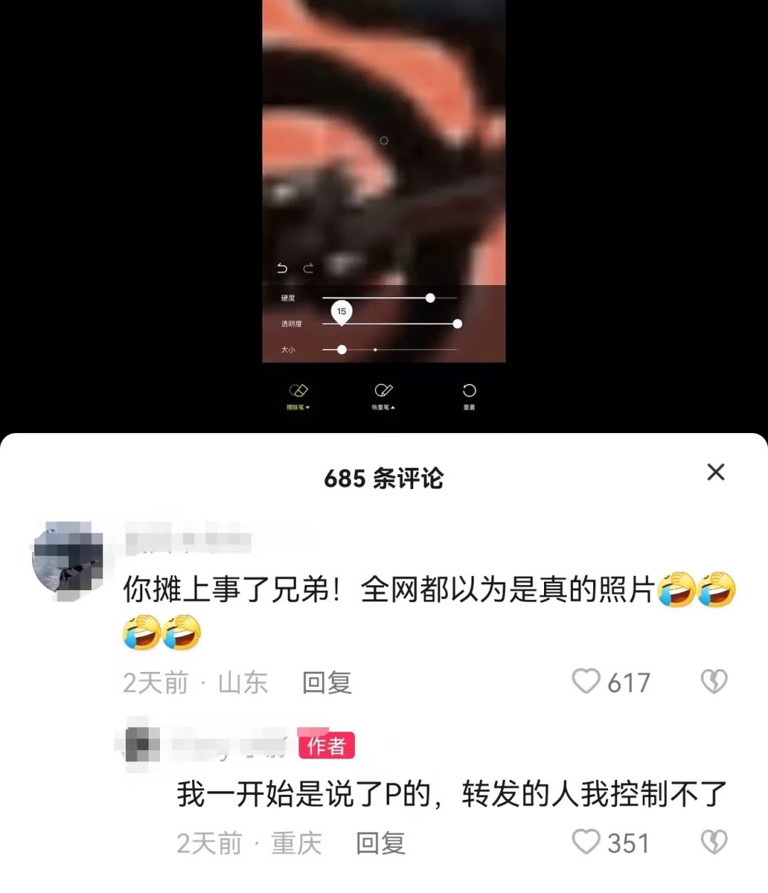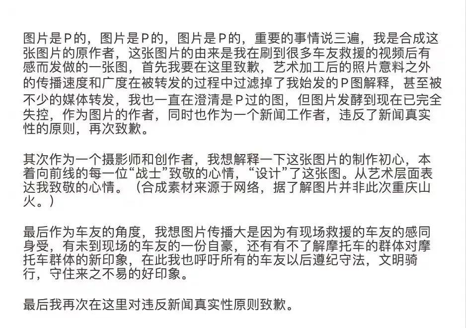 然而,这张图片并非真实的现场图片,而是经软件后期合成。制作者小影说,她在发布这张图片时,曾说明系后期制作,但在后续的传播中,这一点却被忽略了,且传播速度超出了她的想象。