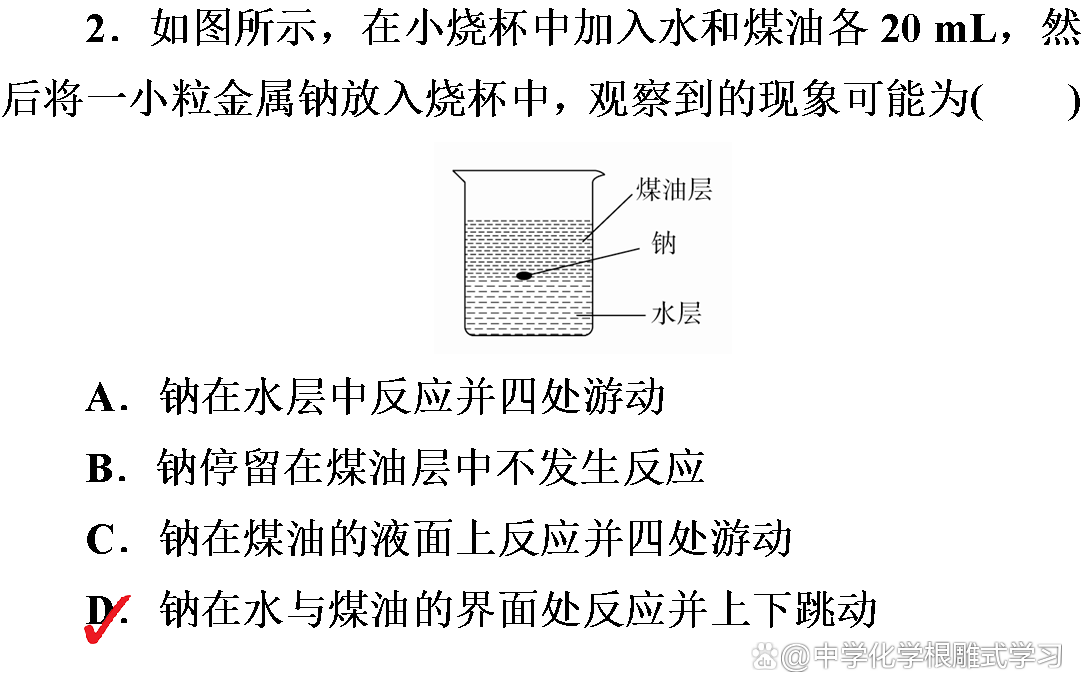 解析 钠的密度大于煤油而小于水,钠不能和煤油反应,因此将钠投入后,钠会位于水与煤油的界面处,与水接触后反应产生的气体推动钠上浮离开水,反应停止,然后在重力的作用下,钠再次沉到水面上发生反应,循环往复,直到钠完全反应。