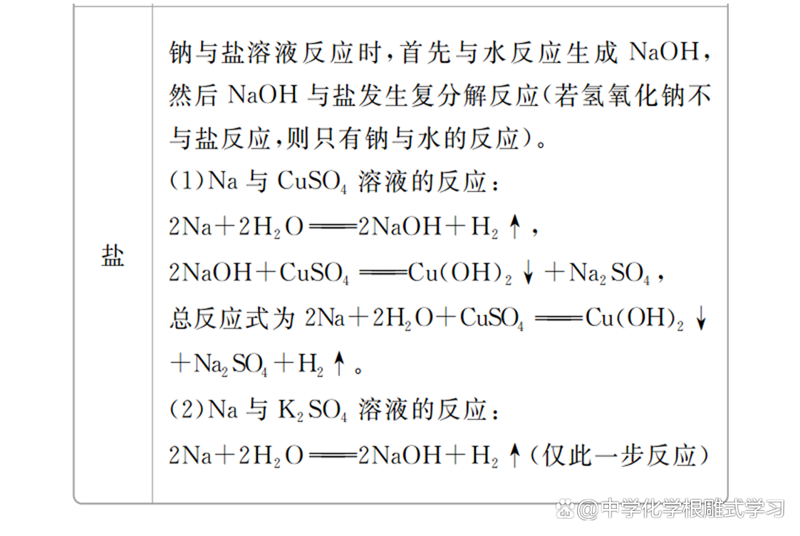 金属钠活动性很强,与铁、锌等金属性质有较大差异,常温下,可与水剧烈反应。当钠与某些盐溶液反应时,应先考虑钠与水反应。