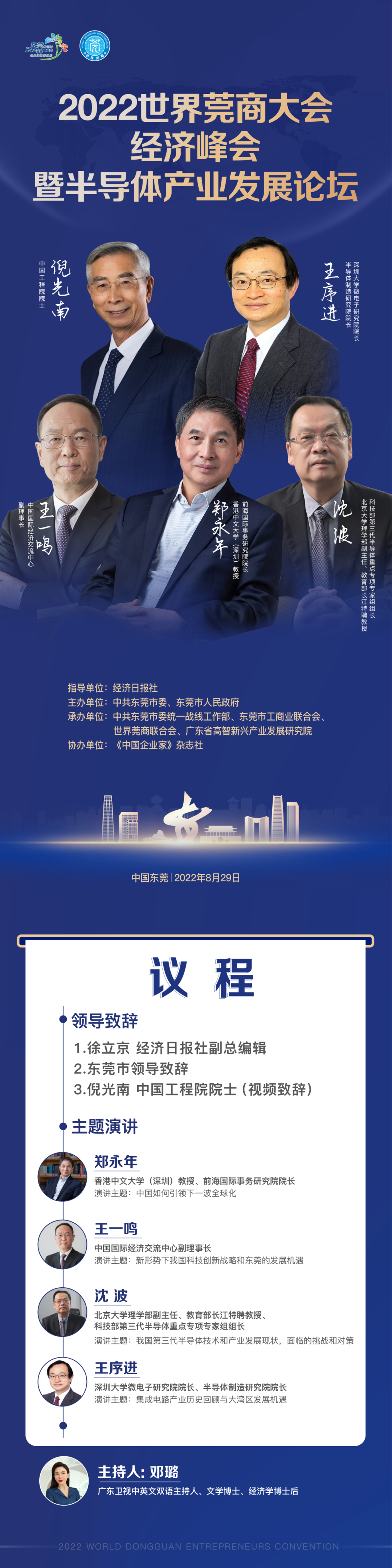 2022世界莞商大会经济峰会暨半导体产业发展论坛将于29日举办,本次论坛以国际化视野和前沿思维,围绕新形势下东莞做强先进制造、充分发挥内需拉动作用、增创外资新优势、大力培育发展半导体及集成电路战略性新兴产业集群、加快推动大湾区半导体产业实现高质量发展等话题展开深入研讨。