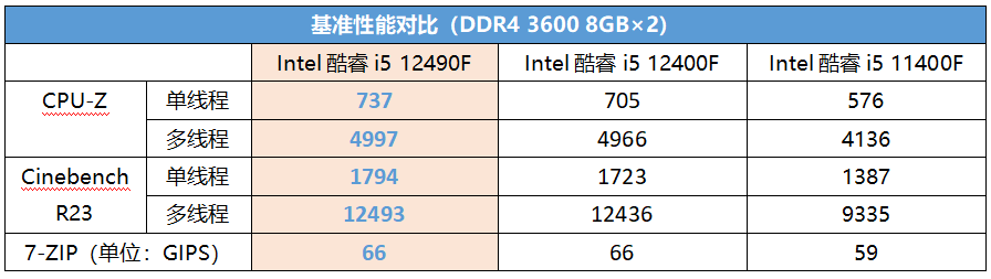 那么,更高的频率和更大的缓存能带来多少实际的性能提升呢?从表中可以看到,酷睿i5 12490F的单线程性能明显是要强一些的,多线程方面也有少许的优势。此外,即便性能进一步提升,酷睿i5 12490F的满载功率依然保持在不到75W的水平,考机温度最高只有58℃,100元风冷完全能够搞定,玩家装机更加轻松。顺便我们也比较了一下酷睿i5 12490F相对上代Intel酷睿i5 11400F的优势,可以看到提升非常大(单核提升约27%,多核提升约21%),所以第11代酷睿i5用户升级到第12代确实是很有实际意义的。