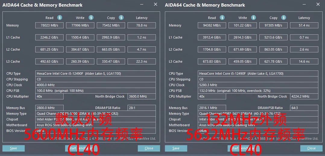由于外频大幅提升,酷睿i5 12490F的内存性能也得到了巨大的提升。从测试成绩可以看到,同样是DDR5 5600水平的内存频率,132MHz外频下的酷睿i5 12490F内存写入速度直接突破了10GB/s,内存延迟也降低了25%,这在内存需求高的专业应用中也会获得更高的执行效率。同时,我们也可以看到,高外频下酷睿i5 12490F的缓存带宽也疯狂提升、延迟巨幅下降,这也是为什么提升外频的酷睿i5 12490F可以获得更流畅游戏体验的重要原因。