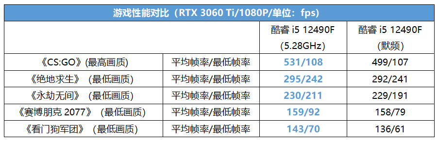 例如在华硕ROG STRIX B660-G GAMING WIFI上,我们把酷睿i5 12490F的外频调节到了132MHz,它的全核频率就从4GHz提升到了5.28GHz,提升幅度高达32%!从游戏实测可以看到,全核5.28GHz的酷睿i5 12490F在部分游戏中的平均帧率提升达到了5%~6%,大部分游戏中的最低帧也有了明显的提升,这就意味着游戏的流畅度变得更高了。