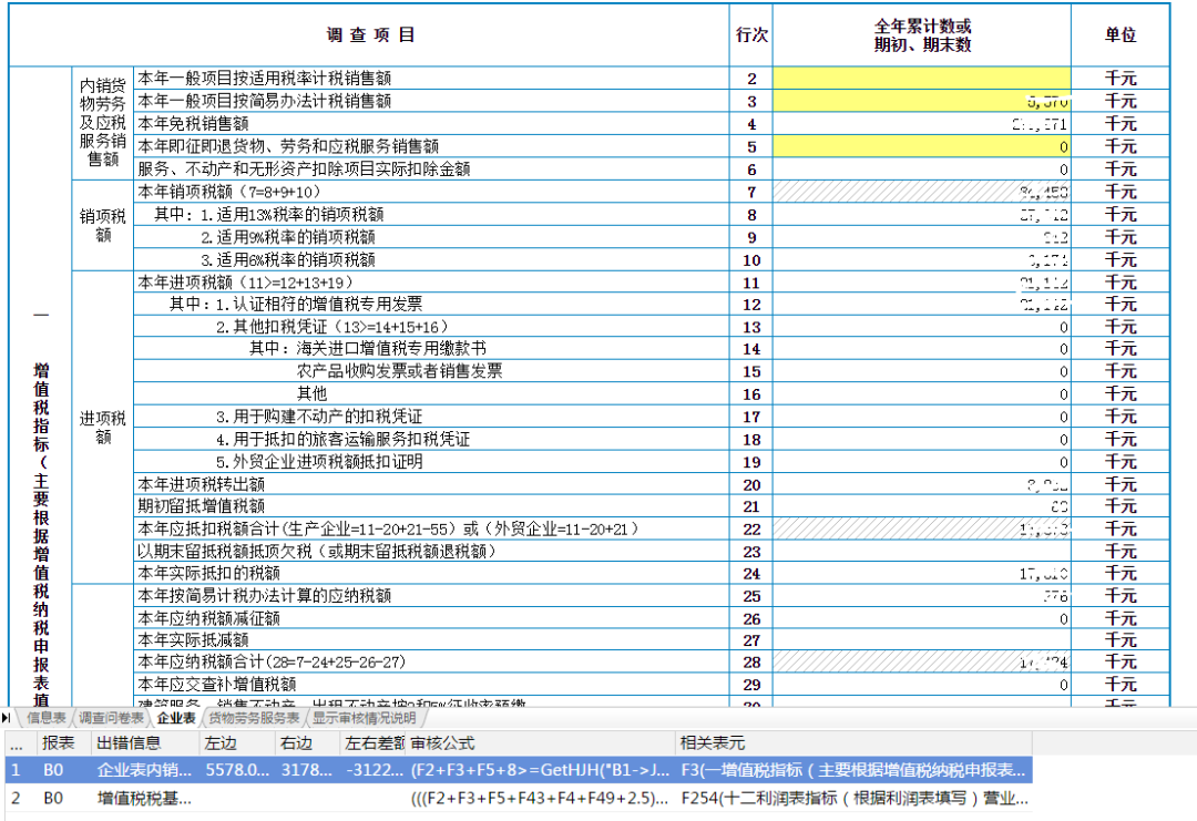 当您审核或切换报表时,单表或表间的错误会按项列示在填报界面下方,错误项在报表中会标记为红色(表示逻辑性错误)或黄色(表示合理性错误),方便您找到错误数据。