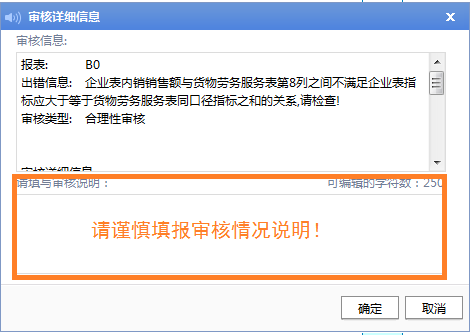 提示错误时,您也可以双击页面下方提示框,弹出审核详细信息,对话框中会列示错误说明和判断依据,请您仔细阅读信息,根据描述修改错误数据。若确认无误,需要在下方的“审核说明”中详细填写具体理由。再次强调,说明信息不可为“审核无误”、“核实无误”等过于笼统的字眼,要讲清楚具体原因。
