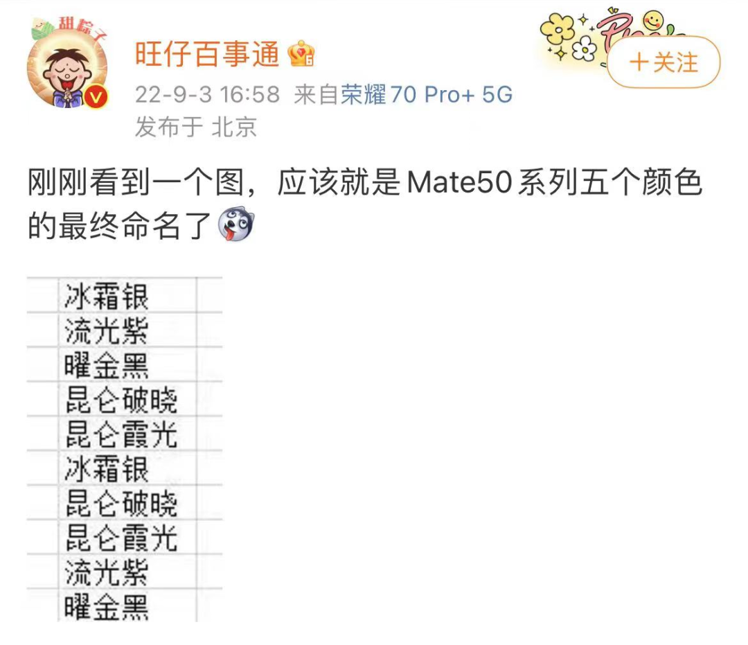 据爆料,华为Mate 50系列共有五款配色,包括流光紫、冰霜银、曜金黑、昆仑破晓(橙)、昆仑霞光(蓝黑),后盖材质包括玻璃和素皮两种,不出意外的话昆仑色应该是素皮版本,而霞光也就是海报中的橙色。