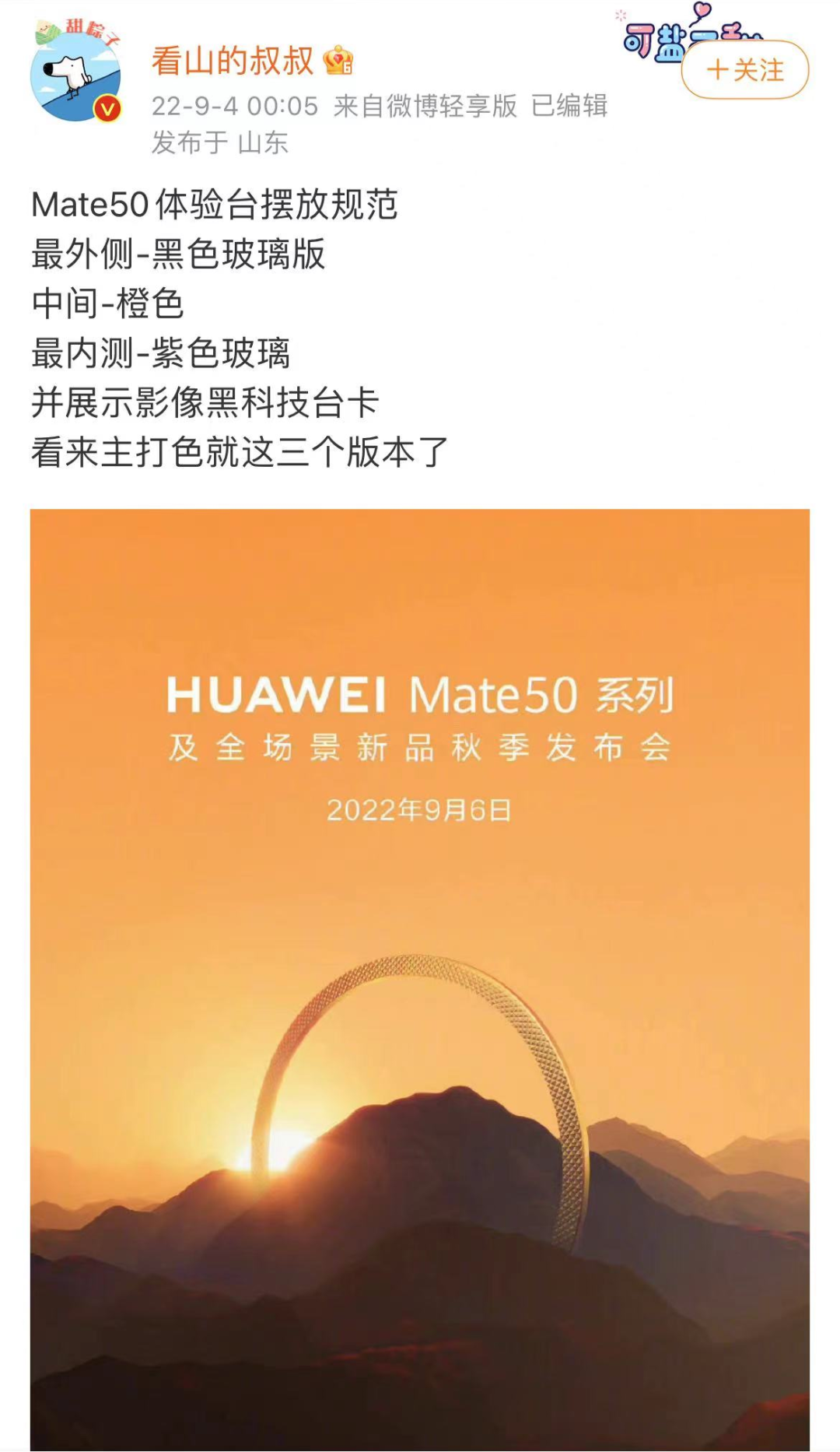 另外,还有博主表示Mate 50系列现在展台最外侧是黑色的玻璃版本,中间是橙色版本,最内侧则是紫色玻璃版本,主打色应该就是这三个版本。