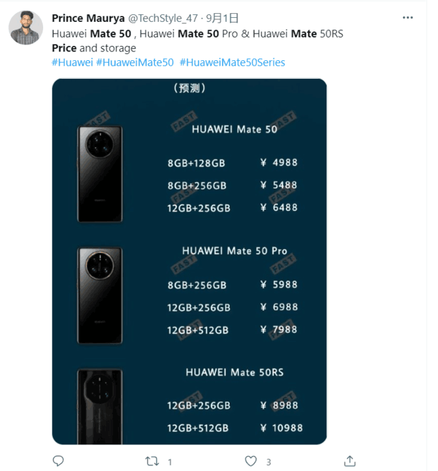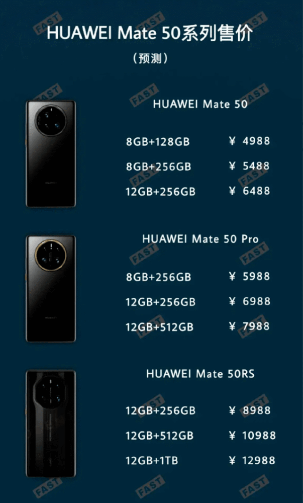 据外网博主爆料,Mate 50预测售价4988元起;Mate50 Pro 5988元起;Mate50 RS 8988元起,最高售价12988元。