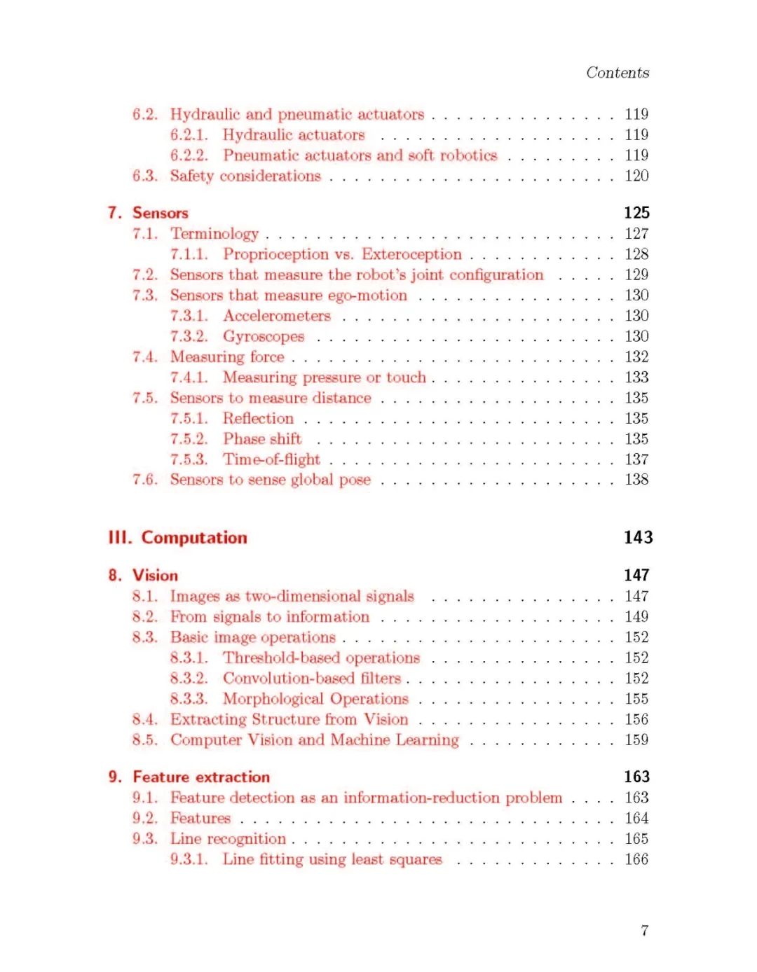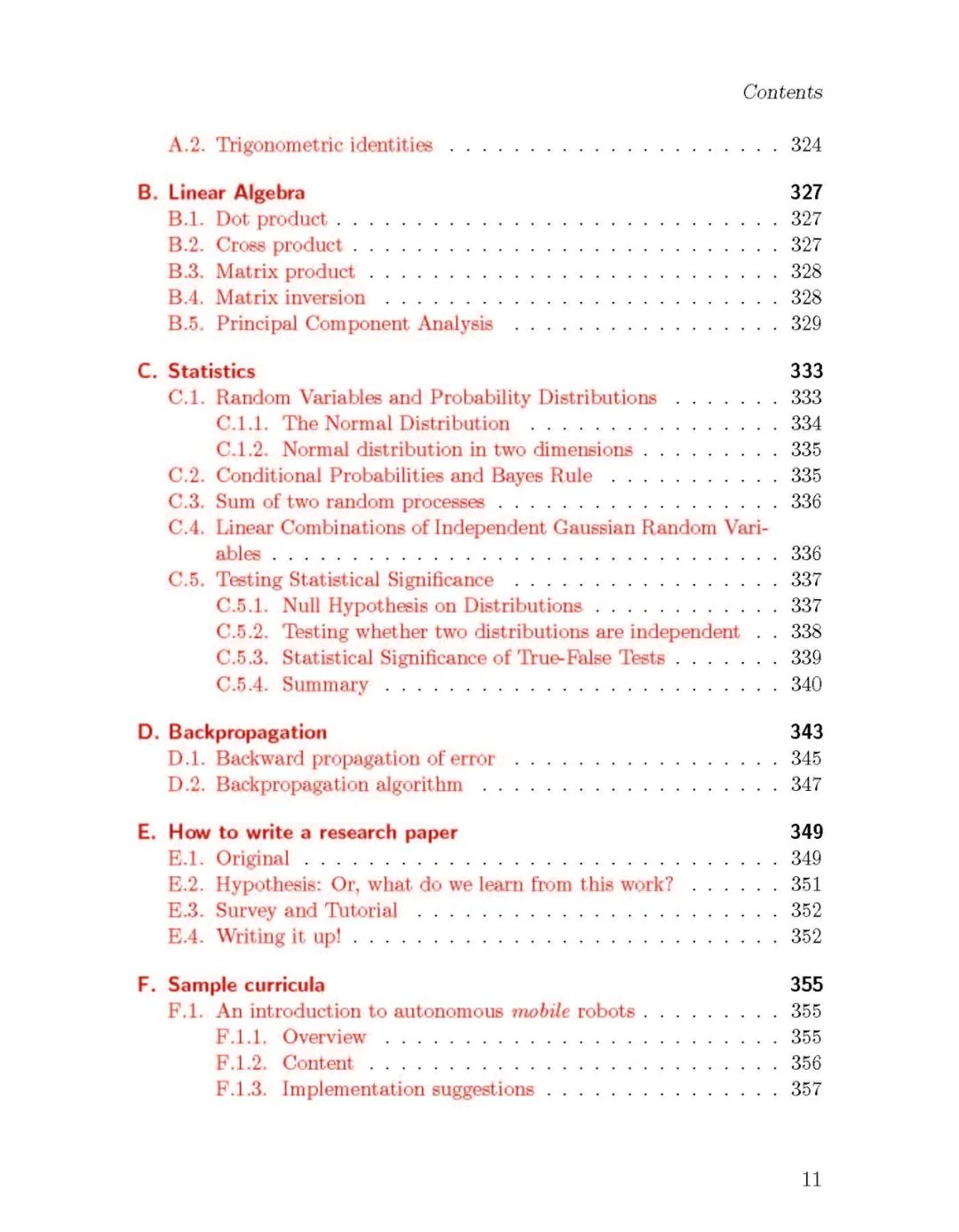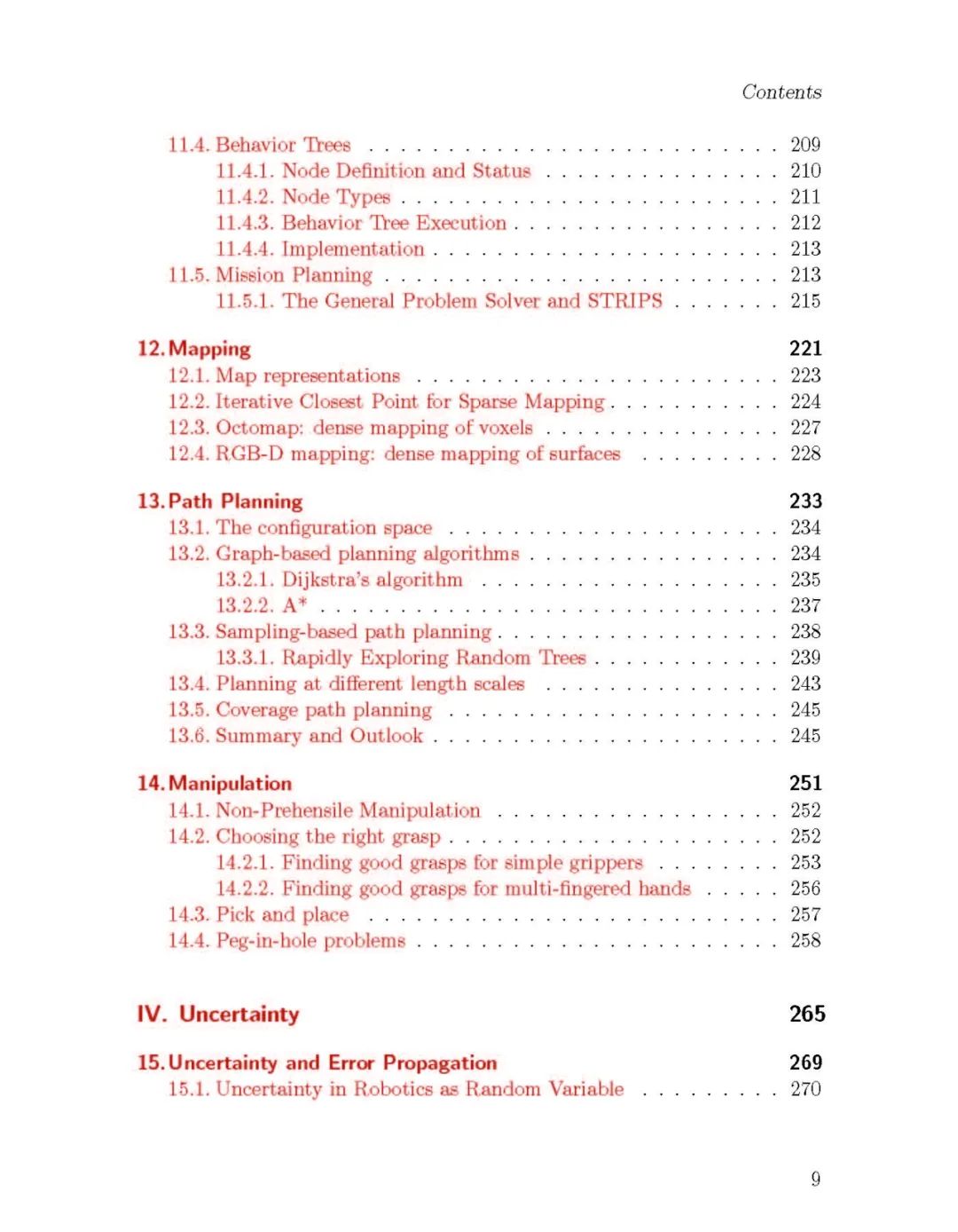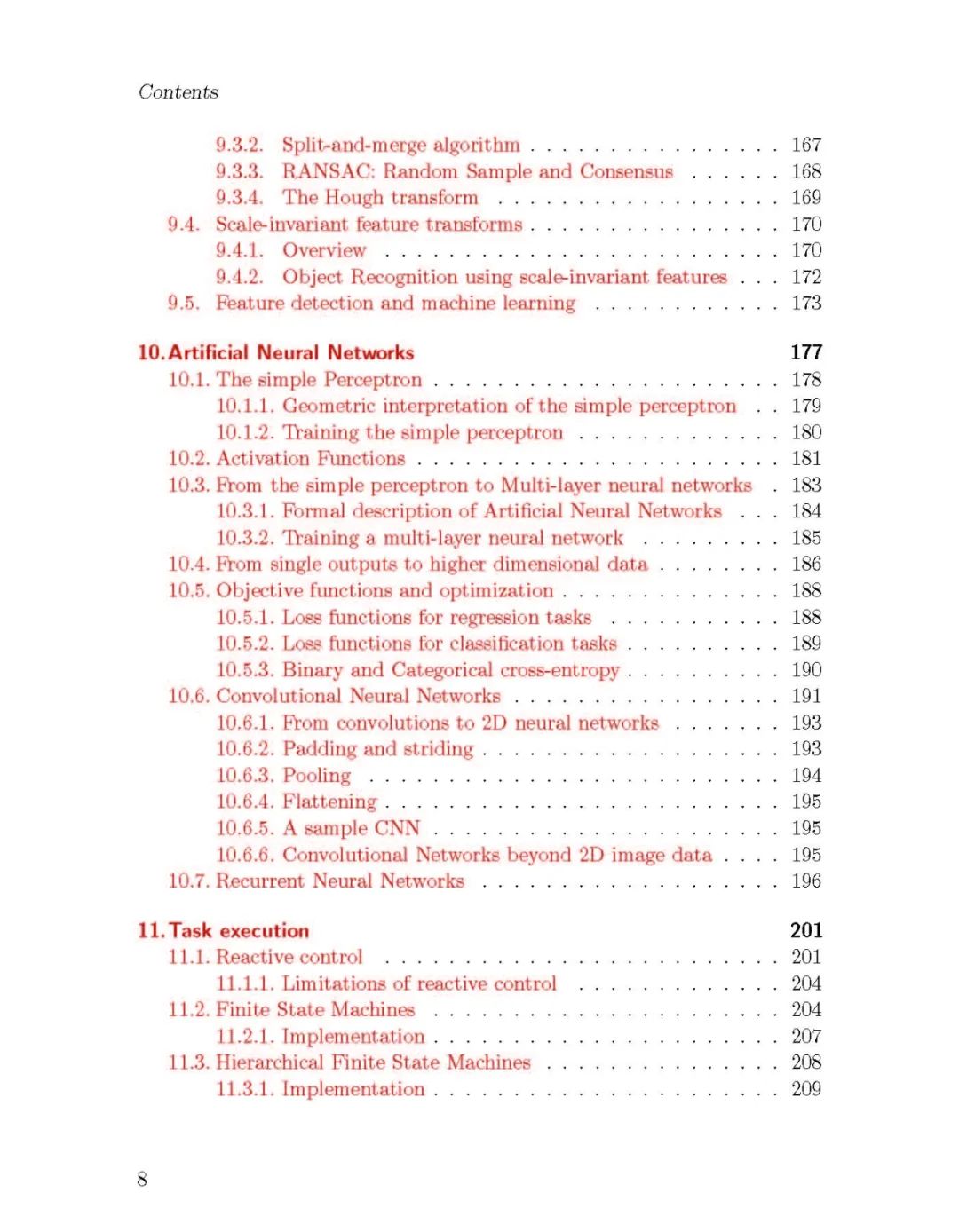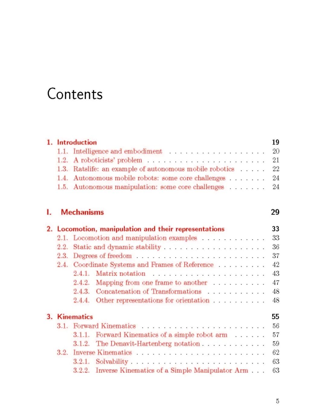 《自主机器人导论》是为工程学和计算机科学专业的本科生编写的,对线性代数、概率论、三角函数和统计学有较深的理解。内容包括机器人机构的基本概念,如运动和抓取,以及产生的力;传感器和执行器的工作原理; 视觉与特征检测的基本算法; 并介绍人工神经网络,包括卷积和循环变体。文本中的二维码引导读者观看在线讲座视频和动画。这本书还提供了广泛的附录,侧重于基于项目的课程,数学的相关领域,反向传播,写一篇研究论文,和其他主题,并伴随着一个开源的,独立于平台的模拟(Webots)中不断增长的练习库。