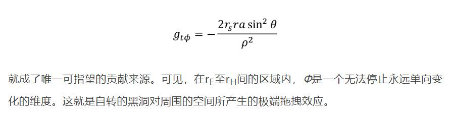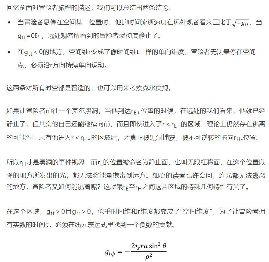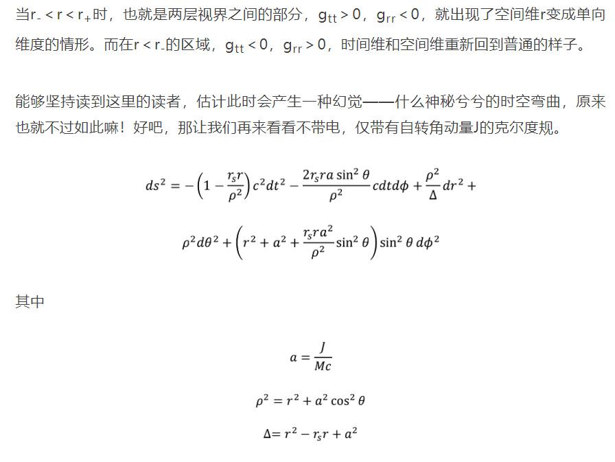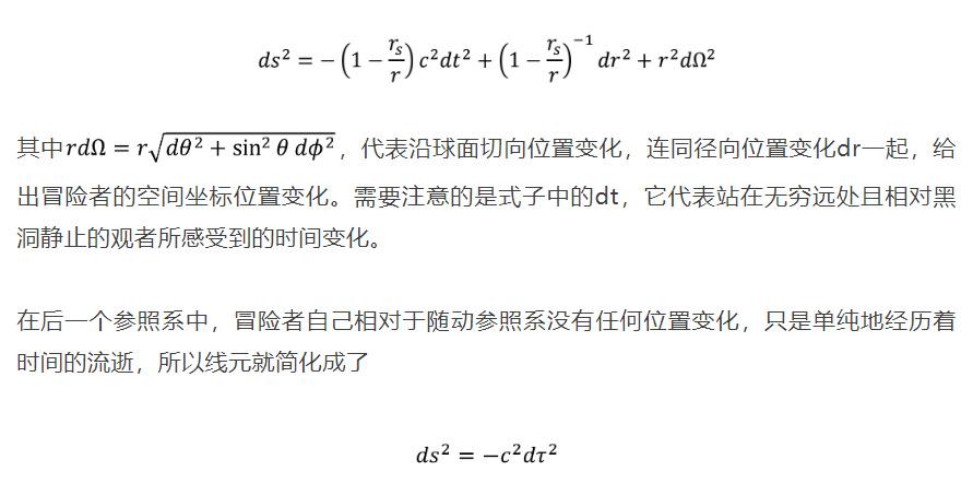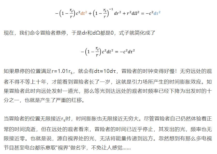 也就是说,进入视界之后的冒险者,根本无法再悬停在任何地方,他必须不断靠近黑洞中心,才能感受到时间的流逝。或者干脆说,在远处观者参照系中的空间维度r,与冒险者参照系中的时间维度τ,建立起了奇妙的对应关系。对冒险者来说,r不再是个能来回移动的空间维度,而是变成了时间一样的单向维度。