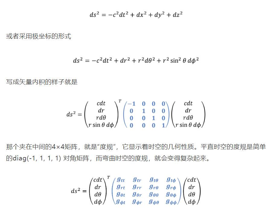 所谓求解广义相对论方程,其实就是计算出度规的所有分量。对时空几何性质的所有刻画,都藏在这个矩阵里。
