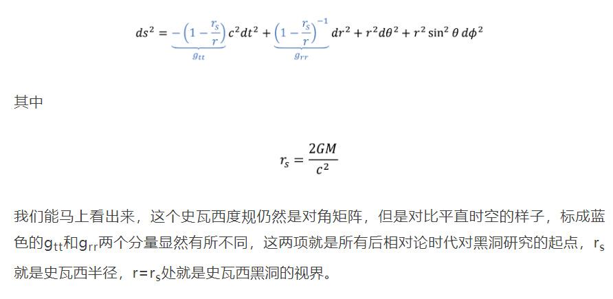 知道了这些,我们就可以根据一个线元的表达式,来阅读出时空度规,继而揣度时空的样子。比如,把不自转,不带电,质量为M的物体放在极坐标原点,它周围的真空线元表达式是