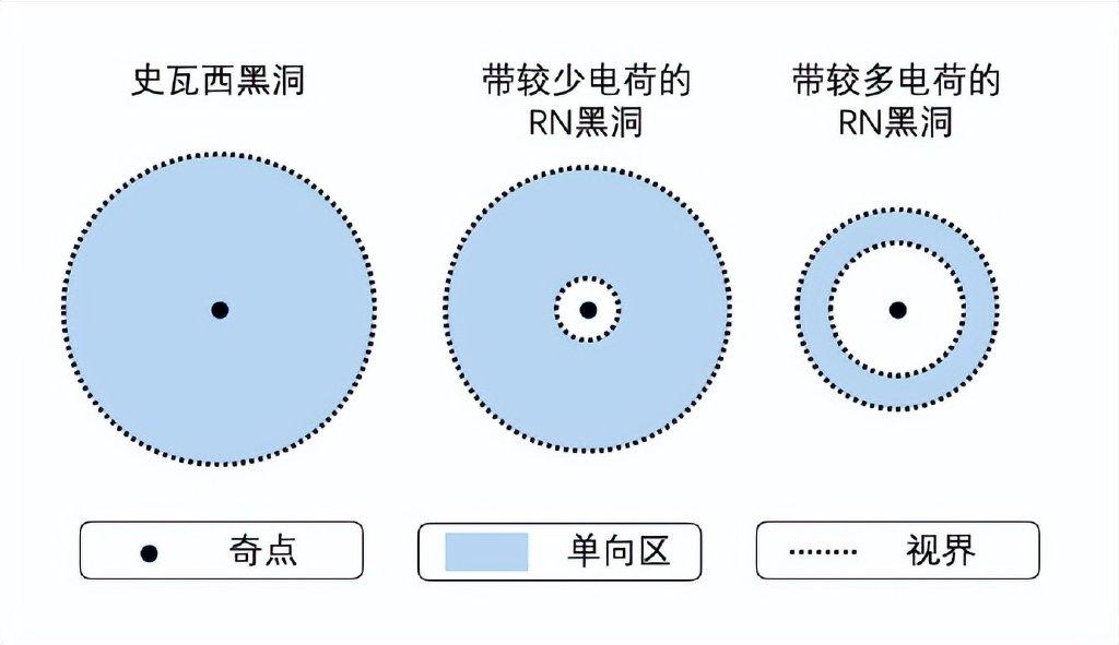 现在我们让黑洞携带上电荷,即RN黑洞,它有内外两层视界,单向区只存在于两层视界之间,黑洞所带的电荷越多,这个球壳状的单向区就越薄。而在内视界以内的区域则又回到普通时空的样子,不存在时间维与空间维互换的情形,黑洞中心的奇点就躺在这片普通时空区域中。