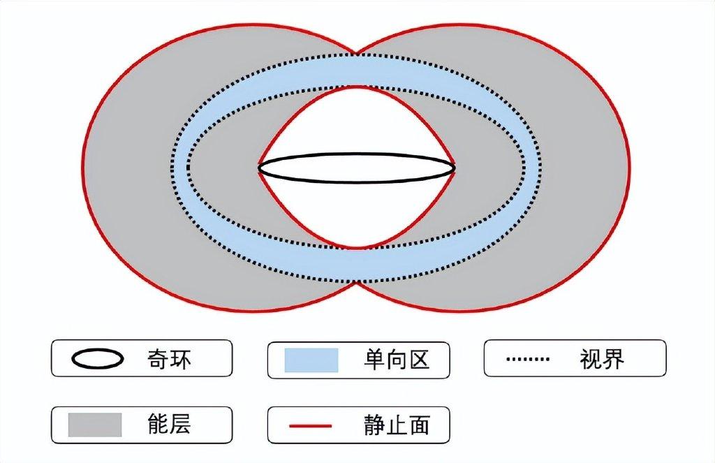 克尔黑洞所展现的结构,基本已经达到了复杂程度的极限,再带上电荷的克尔-纽曼黑洞,并没有比克尔黑洞的结构复杂更多,仍然是内外两个能层夹着单向区的样子,中间也依然是代表时空奇异性的奇环。电荷的多少只是为这些结构的具体位置又多增加了一个参数而已。