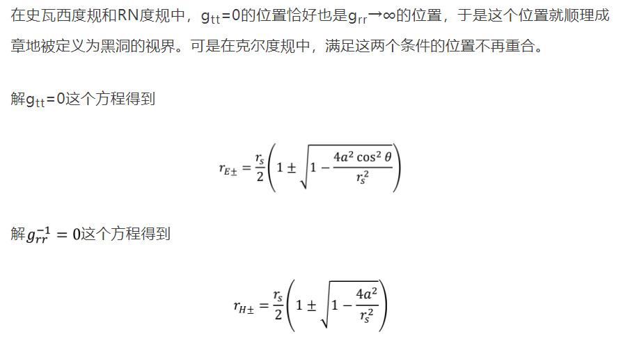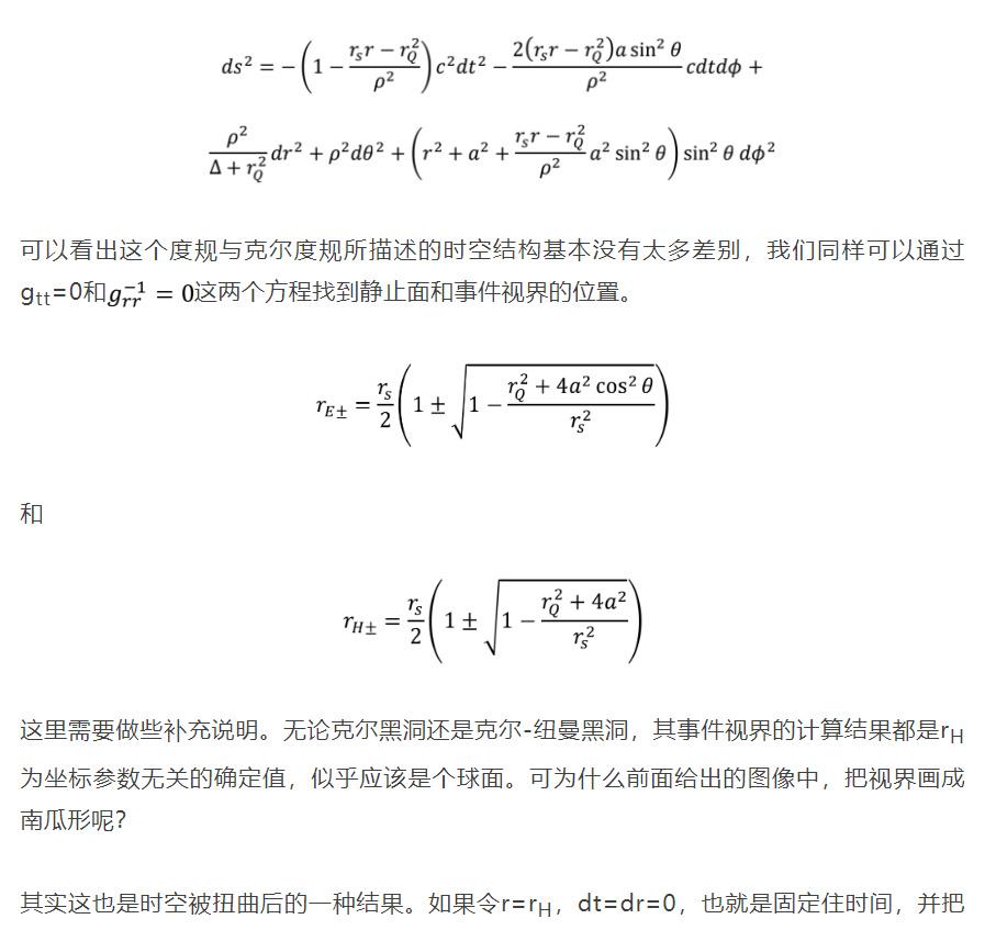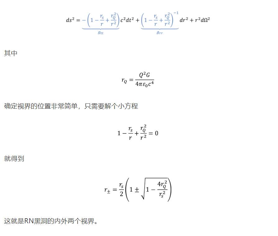 通过前面对史瓦西度规的了解,我们发现原来黑洞的视界就出现在度规的某个分量为零或者发散的地方。依照这个经验,识别其他类型黑洞的视界,自然也可以手到擒来。仅带电,不自转的RN度规是这样的: