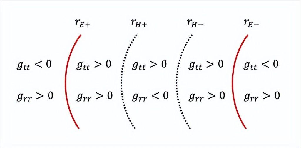 然而前面在计算rH的时候可以看出,如果rQ或者a足够大,也就是电荷或角动量足够大,那么从数学上确实有可能出现rH无解的情况,对应着不存在事件视界的时空结构。倘若如此,奇点就会裸露在我们面前,这是物理学家们内心非常抗拒的场景。为此彭罗斯提出了“宇宙监督假说”(Cosmic censorship hypothesis),认为宇宙一定有某种机制来防止裸奇点的出现。至于这种机制到底是什么,至今也没有特别有力的理论机制。